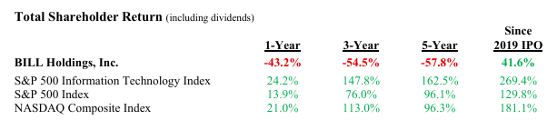 Notwithstanding the Company’s impressive attributes, shareholders have suffered a multi-year period of significant value erosion. As illustrated in the table below, BILL’s total shareholder return has significantly lagged its information technology peers and the broader market since the Company’s initial public offering (“IPO”) in December 2019: