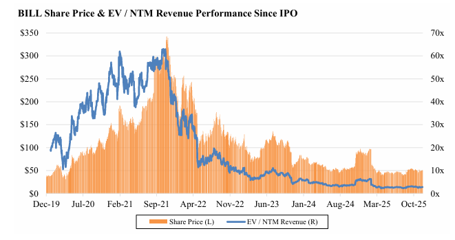 Reflecting these concerns, BILL’s valuation has compressed dramatically. As can be seen in the chart below, BILL’s common stock is currently trading over 85% below its record high of $342 per share reached in November 2021 and is now valued at just 2.8x next twelve months (“NTM”) revenue, near its lowest level in the Company’s history.