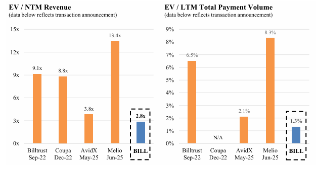 Since 2022, four of BILL’s peers – Billtrust, Coupa Software, AvidXchange and Melio – elected to pursue private market alternatives to maximize shareholder value. As can be seen in the charts below, these four transactions delivered substantially higher multiples on NTM revenue and last twelve months (“LTM”) total payment volume relative to the Company’s current multiples:9 10
