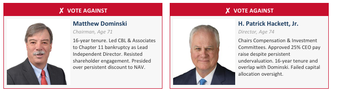 We intend to vote AGAINST the re-election of Chairman Matthew Dominski and Director H. Patrick Hackett, Jr. at the 2026 Annual Meeting and we strongly encourage all shareholders to do the same.