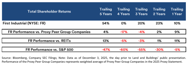 The table below compares FR’s total shareholder return to the Company’s own proxy compensation peers, the very companies the Board selected to benchmark management pay: