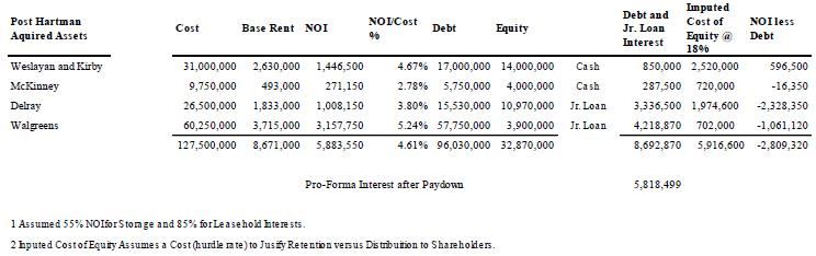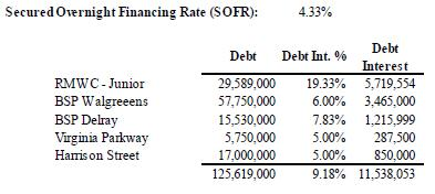 The annual debt interest is $8.7 million before paydown of the RMWC junior debt (which was done with funds that should have been distributed). Assuming full paydown of the RMWC junior debt would mean $32.8 million of equity (which should have been distributed to SSP shareholders) has been invested in assets with expected annual net operating income of $5.8 million. On a pro-forma basis, the on-going annual interest cost will be $5.8 million and imputed cost of equity (which should have been distributed to SSP shareholders) is $5.9 million.