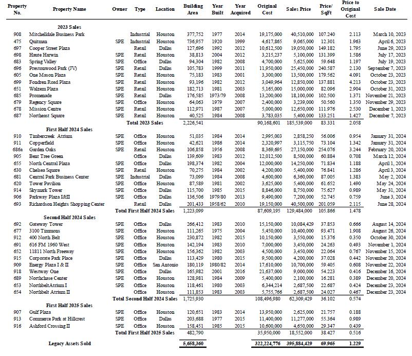 Legacy asset sales in 2023 realized $83.33 per square foot and 2.058 times original cost. Legacy asset sales in the first half of 2024 realized $105.86 per square foot and 1.47 times original cost. Sales per square foot increased 27.04% in the first half of 2024. Legacy asset sales in the second half of 2024 realized $36.10 per square foot and 57.4% of original cost. Sales per square foot decreased 65.89% in the second half of 2024. Legacy asset sales in the first half of 2025 realized $38.42 per square foot and 51.6% of original cost. Sales per square foot increased 6.43% in the first half of 2025. This gradual consistent reduction of price per square foot sales price from $83 to $105 to $36 to $38 each 6-month period shows that they were not taking care of the properties and occupancy dropped and they had to fire sale the assets, especially in the last 12 months. These results directly refute and contradict Mr. Haddock and his SSP colleagues contrived argument regarding purported deferred maintenance.