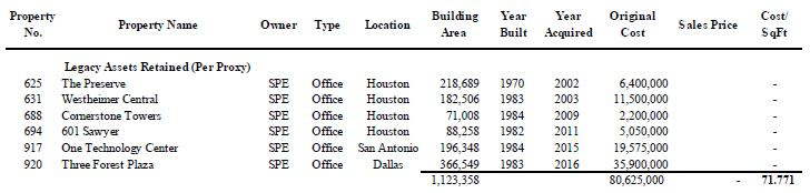 § Mr. Haddock and his SSP colleagues’ rationale and judgment in liquidating SSP legacy assets regardless of price should be further examined. As examples, the sale of Westway for $9.0 million, sale of Northchase for $2.15 million, sale of Atrium I and Atrium II for $5.375 million and sale of Ashford Crossing for $4.65 million need to be compared to the estimated asset values of the properties on or about my separation from SSP including $16 to $23 million for Westway, $5 to $8 million for Northchase, $11 to $15 million for Atrium I and Atrium II and $11 million for Ashford Crossing.