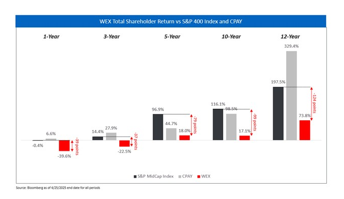 However, the gap between WEX’s intrinsic value and its stock price performance has widened materially over time. Over the past 12 years, WEX has underperformed both its closest peer, Corpay, Inc. (“CPAY”), by over 250 percentage points and the S&P 400 by over 120 percentage points. Both WEX and CPAY began this period with similar assets and positioning, suggesting that the growing divergence is evidence of inferior capital allocation, operational performance, and strategic oversight. The performance gap between WEX and CPAY has only widened in the last year, when WEX’s shareholder returns have trailed CPAY by over 40 points. Despite these troubling results, the Board has proposed no changes to its composition and refused to allow real shareholder representation in its ranks. This underperformance underscores why we are taking a stand against the status quo at this year’s annual meeting.