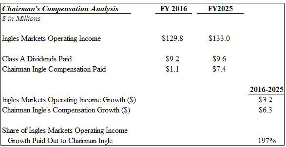 We believe that a lack of effective oversight, facilitated by the Company’s dual-class structure that allows Chairman Ingle to elect 75% of the Board despite owning only 23% of the combined share capital, has contributed to Ingles’ underperformance. This troubling lack of boardroom accountability is also to blame, in our view, for the Company’s misallocation of shareholder capital, deteriorating operational performance and misalignment between performance and pay for executives.