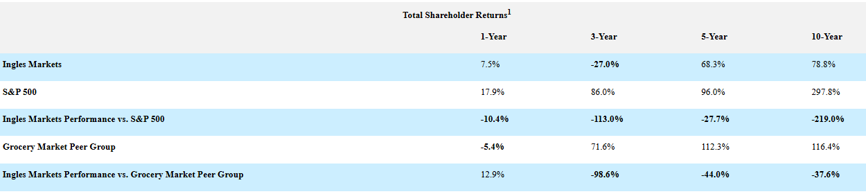 As we detail in our definitive proxy statement (which we encourage you to read), Ingles leadership has presided over prolonged periods of underperformance, maintained a culture of opacity and prioritized their own capital returns while keeping our dividends stagnant for decades. The Company’s total shareholder returns have consistently and significantly trailed the broader market over the short-, medium- and long-term, as well as the Company’s peer group during such periods other than the last year: