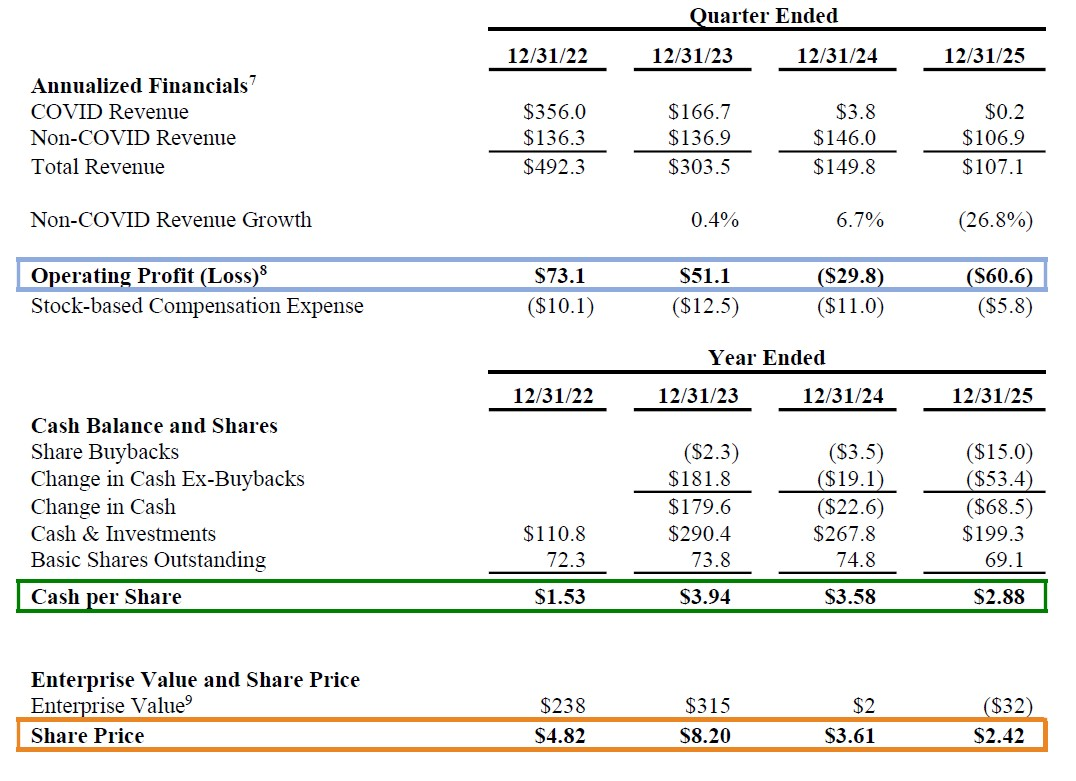By year-end 2025, OraSure’s cash had diminished to $199 million ($2.88 per share)—a decline of over $90 million since the end of 2023. Non-COVID revenue had fallen to an annualized rate of $107 million, 27% below its 2024 run rate. Excluding approximately $5 million in share repurchases last quarter, cash is declining at roughly $12 million per quarter, driven by operating losses of approximately $15 million per quarter, which include $2–3 million in quarterly stock-based compensation.13 The trajectory is clear.