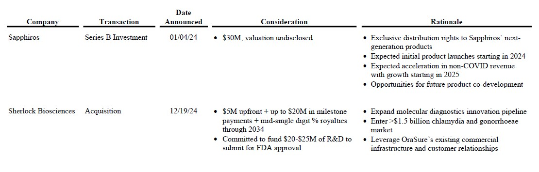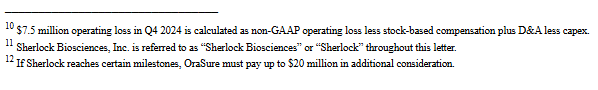 Prior to closing its 2024 fourth quarter, OraSure committed at least $25 million to acquire Sherlock Biosciences, an early-stage diagnostics company with no commercial products.11 The acquisition is troubling not only on its merits, but also because of the circumstances surrounding it.