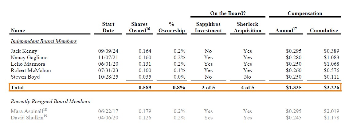 - A Board Without Skin in the Game. Independent directors collectively own less than 1% of shares outstanding yet collect over $250,000 each per year in compensation. They bear little financial risk for decisions that have destroyed shareholder value. Shareholders who face the very real risk of losing money on their investment deserve a larger voice on the Board.