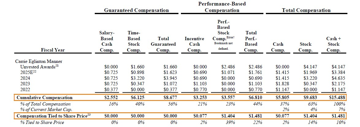 - Pay Without Performance. Over 90% of CEO Carrie Eglinton Manner’s compensation is not tied to share price performance. She has earned an estimated $15 million over her tenure while shareholders have lost 60% of their investment since 2023. Her incentives are plainly misaligned with shareholder interests.