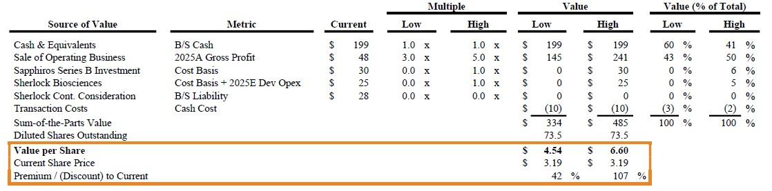 We believe OraSure is worth significantly more in a sale than as a standalone company. We value each component separately: the cash on its balance sheet, the current operating business, and the potential value of recent investments and acquisitions. At present, much of the value in OraSure’s share price simply reflects its cash balance. We believe the remaining operating business, including its underutilized manufacturing facility, could be worth between $145 million and $241 million to a strategic buyer. After deducting transaction costs (and valuing OraSure’s recent investments at cost in our “High” case), we estimate OraSure is worth $4.54 to $6.60 per share if sold—a 42% to 107% premium to today’s price. Through a competitive bidding process, especially if a buyer can underwrite significant synergies, these values could prove conservative.