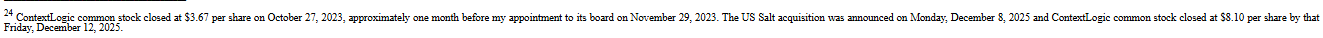 In February 2025, I secured a $150 million strategic investment into ContextLogic from BC Partners, a well-known and highly-regarded investment firm founded in 1986 with over $40 billion of assets under management. Together, my colleagues at BC Partners and I, along with our excellent management team and board of directors, spent the next nine months continuing ContextLogic’s search for an acquisition target. On December 8, 2025, ContextLogic announced its acquisition of US Salt for $907.5 million, a transaction backstopped in part by newly committed capital from BC Partners, and I stepped down from my position as CEO. Following the announcement, ContextLogic’s shares closed at $8.10 per share, up over 120% from the low of $3.67 per share where its stock traded prior to my joining its board.24