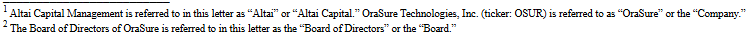 Altai Capital Management owns approximately 5% of OraSure Technologies, making us one of the Company’s largest shareholders.1 On December 17, 2025, we wrote to the Board stating our intention to nominate two candidates—John Bertrand, Co-Founder and former CEO of Digital Diagnostics, and myself, Rishi Bajaj, President and CIO of Altai Capital—for election at the 2026 Annual Meeting. Since that letter, Altai Capital has submitted formal nominations.2 We will be asking all shareholders to vote in favor of our nominees at the 2026 Annual Meeting. Please see Exhibits A and B, respectively, for my and Mr. Bertrand’s biographies.