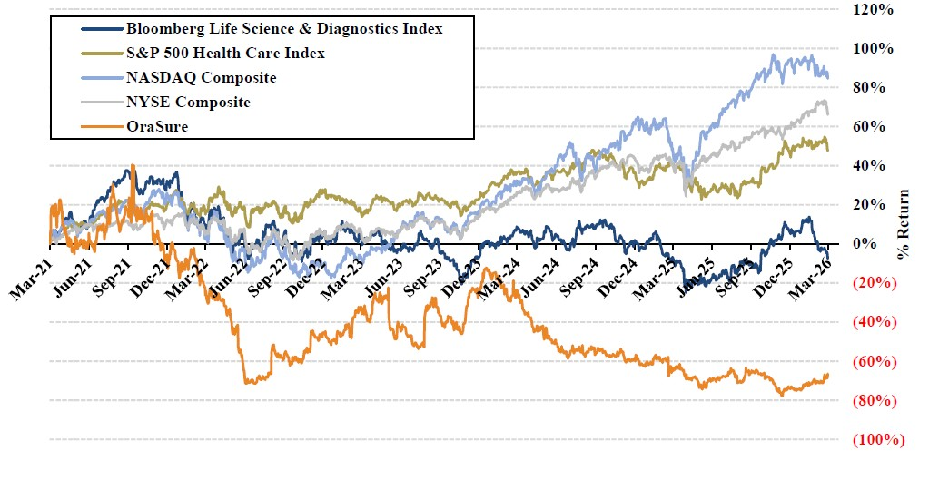 - Chronic Underperformance. OraSure’s share price has dramatically underperformed comparable companies and broader indices over both five- and ten-year periods. Recent underperformance has been driven by repeated operational and strategic failures under the current management team—failures that occurred on the Board’s watch. Despite this track record, the Company continues to burn cash pursuing speculative diagnostics investments to the detriment of shareholders.