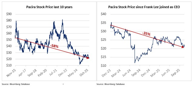 We find Pacira’s continued lack of shareholder return unacceptable.ii The Board has allowed management to spend many millions of dollars in what we consider to be an ill-advised and wasteful manner, given Pacira’s financial performance.iii Further, we believe it was a mistake for the Board to move the company’s headquarters across the country, burning cash on new and expensive offices.iv As we see it, the executive stock-based compensation level is out of control relative to the company’s size. Full-year 2025 guidance indicates the stock-based compensation could amount to approximately 6% of Pacira’s market capitalization,v and year-to-date stock-based compensation is larger than the firm’s entire operating income.vi Our position is this represents a wholly irresponsible way to manage the company’s finances, and the Board must rectify this complete lack of prudent financial conduct.