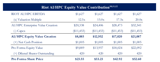Factoring in Riot’s estimates for the cost to build out this capacity, and valuing it at a range of discounts to data center multiples, we believe the equity value contribution from AI/HPC data centers at Corsicana and Rockdale could be $9 to $21 billion, dwarfing Riot’s current market cap. Taking into account Riot’s net cash balance, this would imply that Riot is worth between $23 and $53 per share, even without ascribing any value to its bitcoin mining or engineering businesses or its NOL carryforwards.10 5