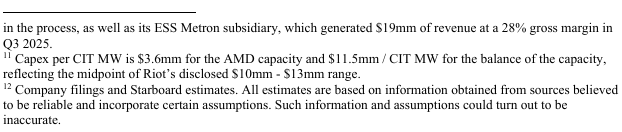 Riot announced its inaugural data center deal on January 16, 2026 with AMD, demonstrating the Company’s ability to attract highly sophisticated, investment-grade tenants. In the initial deal, AMD committed to take 25 CIT MW that can expand to 200 CIT MW. The initial 25MW lease is expected to generate $311 million of revenue across an initial 10-year term with an EBITDA margin of ~80%. This translates to $1.24 million of annual revenue and $1 million of EBITDA per CIT MW. Critically, the Company can retrofit existing infrastructure at Rockdale for a capex cost of just $3.6 million per CIT MW, which is meaningfully below precedent AI/HPC transactions, making the yield-on-cost highly attractive.3 This capacity is slated to be delivered by May of this year, an impressive feat that we hope will demonstrate the execution capabilities of Riot’s new data center team.4