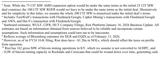 This should be just the beginning. With 1.4GW of gross capacity remaining to be monetized, Riot is in an enviable position – but it must execute with excellence and urgency.5 We believe Riot should be able to attract high-quality tenants for tier-3 data centers with terms similar to or better than the peer transactions announced towards the end of 2025.6 If Riot can monetize its power in line with recent precedent transactions, we believe it could generate more than $1.6 billion of annual EBITDA.7