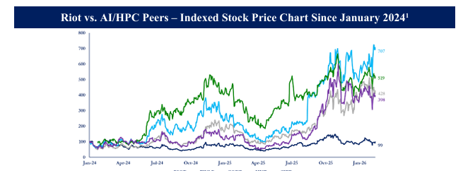 As you can see below, Riot’s share price has materially underperformed peers who have signed sizable AI/HPC deals.1